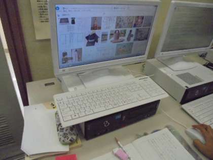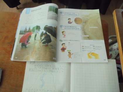 (上)国語の学習です。パソコンで、暮らしの中の「和」について調べています。(中・下)理科の学習です。流れる水のはたらきについて、実習しています。