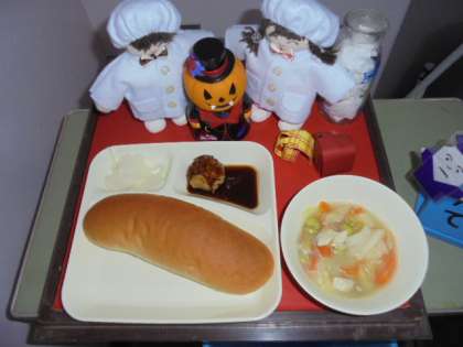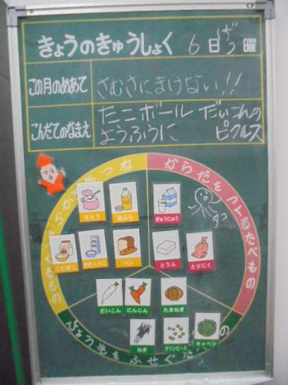 今日の献立は、たこボール、洋風煮、だいこんのピクルス、パン、牛乳です。たこボールは、給食調理員さんが、ひとつずつ愛情を込めてこね、揚げてくださった逸品です。