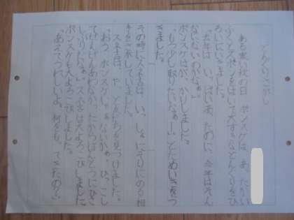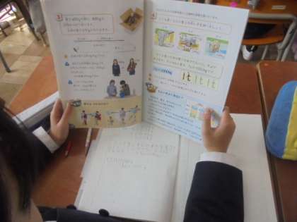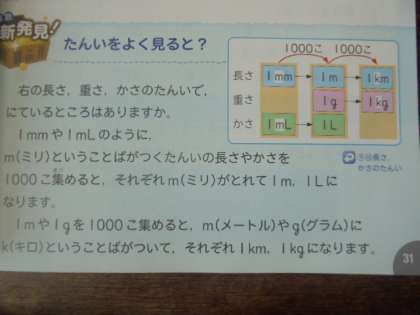 (上・中)算数で、単位について考えています。(下)創作物語ができました。みんなの前で発表しました。