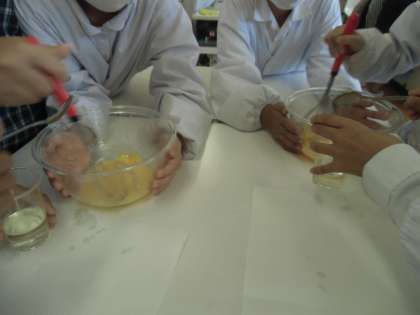 まずは、「マヨネーズのひみつ」や「裏ワザ」「できるまで」を学び、いざ、マヨネーズ作りへ。