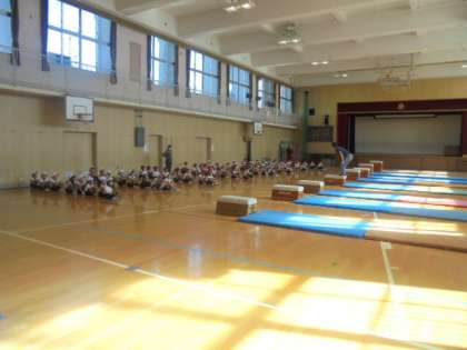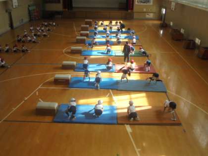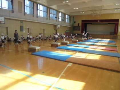 体育館で、跳び箱をしています。怖さをおさえるため、少しずつ段階を追って指導しています。