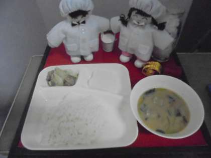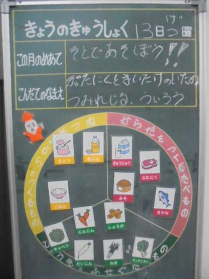 今日の献立は、豚肉とまいたけのいためもの、つみれ汁、ういろう、ごはん、牛乳です。ういろうは、上新粉と砂糖をまぜて蒸しあげた給食調理員の手作りです。
