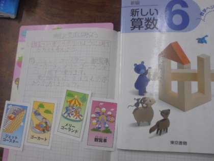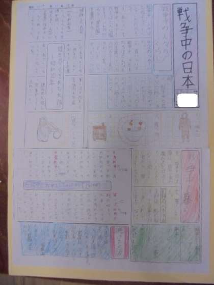 (上・中)算数の学習です。書画カメラを使って、わかりやすく指導しています。(下)平和新聞です。ピースおおさかの社会見学をまとめました。