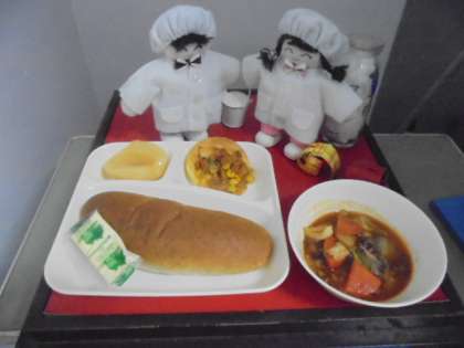 今日の献立は、牛肉のケチャップ煮、変わりピザ、白桃(缶)、パン、牛乳です。