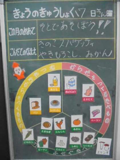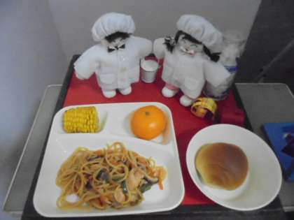 今日の献立は、きのこのスパゲッティ、焼きとうもろこし、みかん、パン、牛乳です。給食調理員の皆さん、今週一週間も、おいしい給食を作ってくださってありがとうございました。