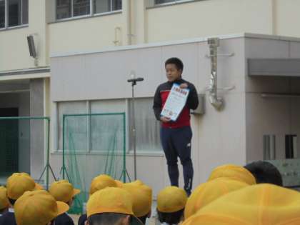 今朝の全校朝会の司会は、5年1組の田中先生です。11月の生活目標について、お話されました。
