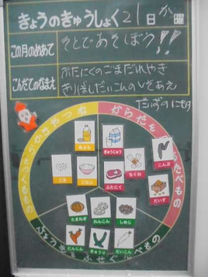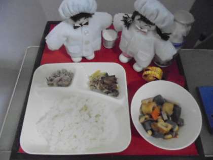 今日の献立は、豚肉のごまだれ焼き、大豆の煮もの、切り干しだいこんのしそ甘酢づけ、ごはん、牛乳です。