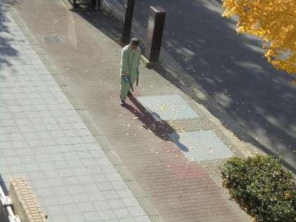 管理作業員の小林さんが、歩道の落ち葉をブロワで集めてくださっています。学校周辺をきれいにしてくださって、ありがとうございます。