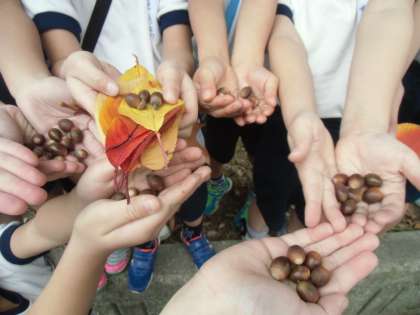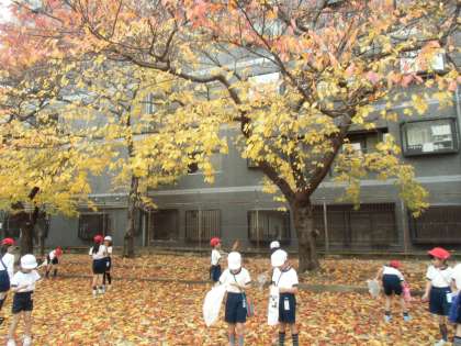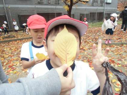 春に行ったときは草木が緑一色でしたが、秋の公園は葉が赤や黄に色づき、とてもきれいでした。子ども達は落ち葉のシャワーに大興奮でした。
