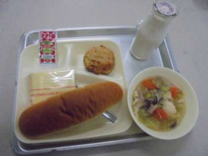 今日の献立は、とうふハンバーグ、スープ煮、スライスチーズ、パン、牛乳です。とうふハンバーグは、給食調理員の皆さんがひとつずつ手作りをしてくださった逸品です。