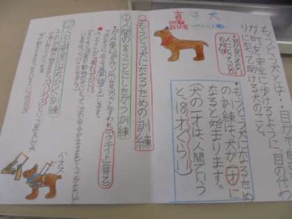 (上)「お笑いボックス」発見。何が入っているか、気になります(笑)。(中)音楽で、曲のリズムを静かに聞いています。(下)盲導犬について、詳しくまとめています。