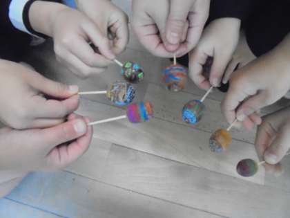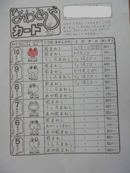 (上)どんぐりに色を塗り、こまを作りました。1年生の子どもたちが集まってきて、「見て、見て〜」(下)「なわとびカード」です。寒さに負けず、元気に体力づくりをすすめています。