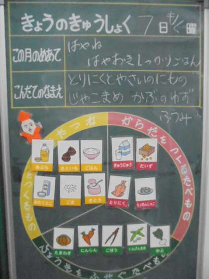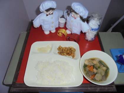 今日の献立は、鶏肉と野菜の煮もの、じゃこ豆、かぶのゆず風味、ごはん、牛乳です。