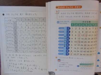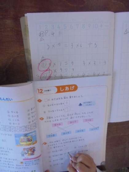 算数の九九の勉強をがんばっています。高学年のおにいさん、おねえさんにも九九をきいてもらっています。