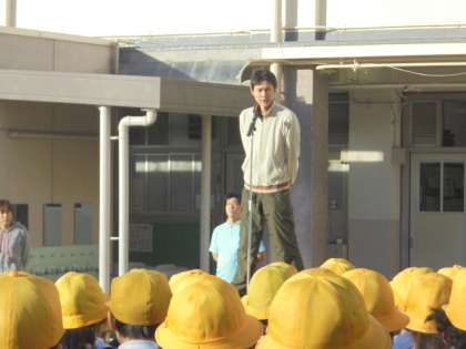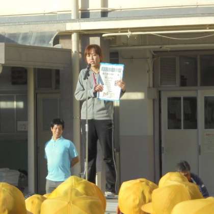 (上)司会は、4年2組担任の四野先生です。(下)生活指導部長の細田先生からは、下校後の安全な過ごし方についてお話がありました。