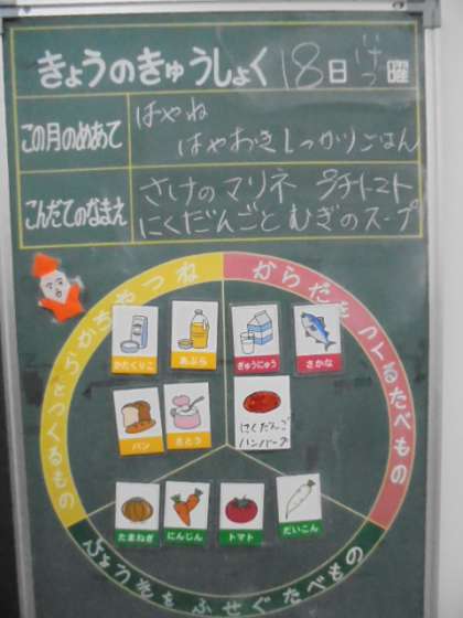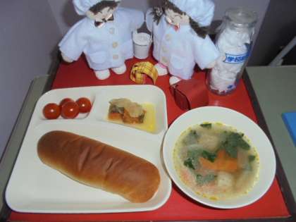 今日の献立は、さけのマリネ、肉だんごと麦のスープ、プチトマト、パン、牛乳です。
