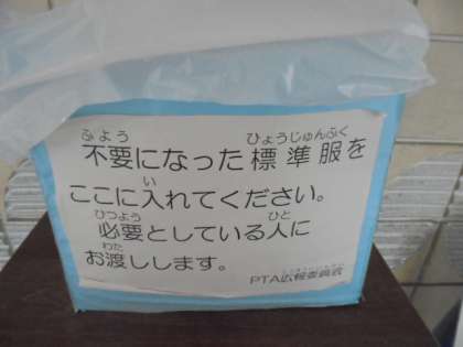 PTA広報委員会の皆様の呼びかけで、不要になった標準服を集めています。ぜひ、ご協力をお願いします!