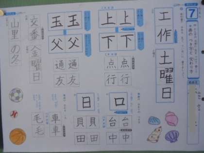 (上)国語の漢字プリントを勉強しています。