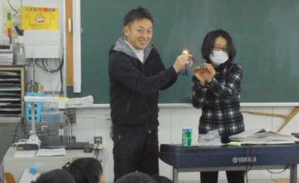 (上)理科の学習です。「電気で明かりをつけよう」の実験が大成功!ニコニコです。