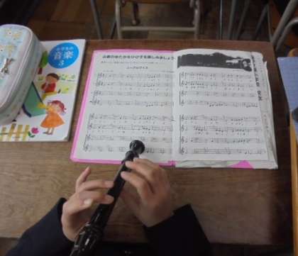 (上)リコーダーで、エーデルワイスを演奏しています。美しい音色が教室に響いています。(下)ビーズで作ったお正月の風景。おめでとうございます!