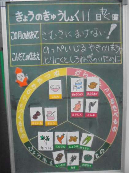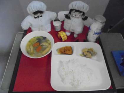 今日の献立は、鶏肉と白ねぎのいため煮、のっぺい煮、焼きかぼちゃのごまだれかけ、ご飯、牛乳です。