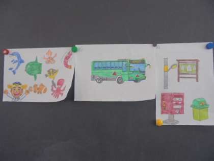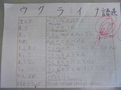 (上)ウクライナで使われている言葉を調べてくれました。すごい!(下)教室後ろの黒板にバスなどの絵が上手です。