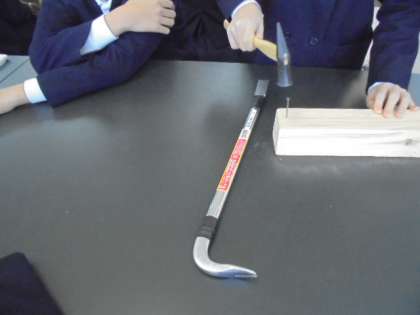 てこのはたらきについて、学習しています。実際に木片にくぎを打ちつけてから、抜いています。