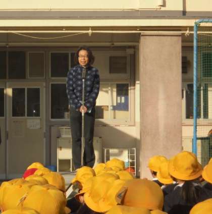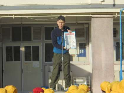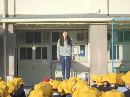 (上)司会の細田先生から、1月の生活目標についてお話です。(中)鎌田先生から、給食週間についてお話です。(下)保健室の大久保先生から、かぜやインフルエンザ予防についてお話です。