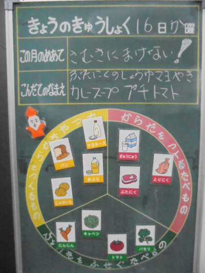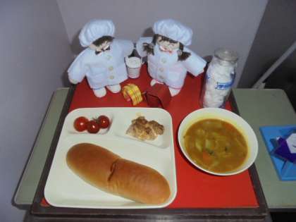 今日の献立は、豚肉のしょうゆマヨネーズ焼き、カレースープ、プチトマト、パン、牛乳です。