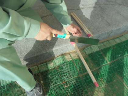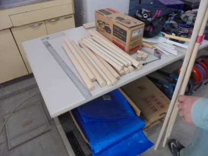 管理作業員の小林さんが、太鼓のばちを作ってくださっています。ホームセンターで購入した棒をのこで切り落として、ていねいな作業ぶりです。ありがとうございます!