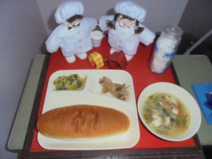 今日の献立は、豚肉のオイスターソース焼き、糸寒天のスープ、ピリ辛あえ、パン、牛乳です。