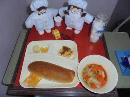 今日の献立は、鶏肉と野菜のケチャップ煮、カリフラワーとコーンのサラダ、桃のクラフティ、パン、牛乳です。
