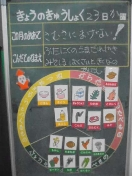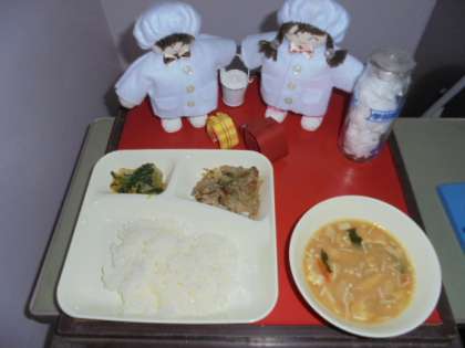 今日の給食は、豚肉のごまだれ焼き、みそ汁、きくなと白菜のおひたし、ご飯、牛乳です。