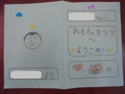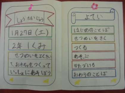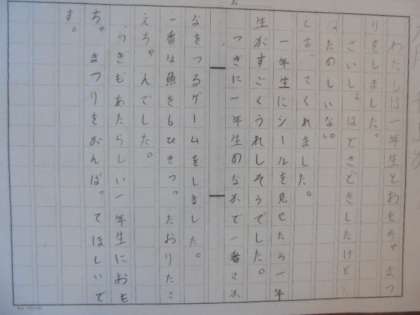 (上・中)2年生から1年生への招待状です。(下)2年生の子どもが書いた作文です。1年生への優しい気持ちが嬉しいですね。