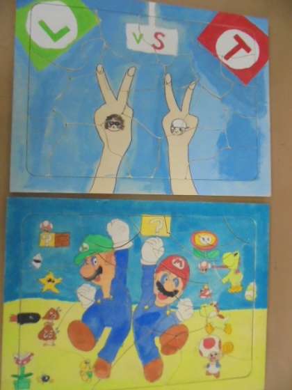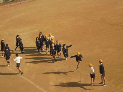 (上)図画工作科でパズルを作ります。電動のこぎりで、板を切りました。(下)運動場で長縄をしています。