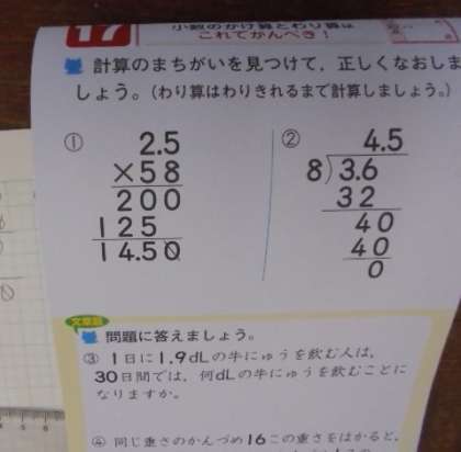 (上)国語の学習です。3年生の漢字を復習しています。(下)算数の学習です。小数のかけ算とわり算です。