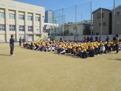 今日の午前10時40分ごろに、地震を想定した避難訓練がありました。子どもたちには今日行うと予告していませんでしたが、スムーズに避難をすることができました。写真は、子どもたちが防災教育担当の竹下先生の話を聞いているところです。