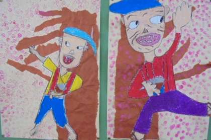 (上)1年1組が今日から学習再開です。(中)「はなさかじいさん」の作品です。(下)算数で、とけいについて学習しています。