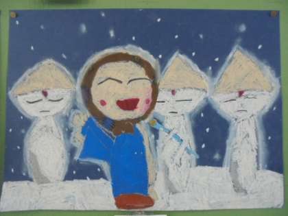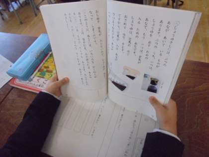 (上)国語で、「あなのやくわり」について勉強しています。(下)国語の教科書にある「かさこじぞう」の絵です。
