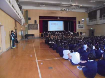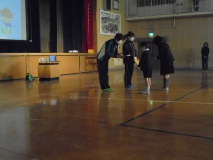 (上)今朝の児童集会は、給食委員会の子どもたちが給食クイズを出してくれました。(中)その後、全学年の子どもたちから、給食調理員さんへありがとうの気持ちを込めたカードをお渡ししました。(下)給食調理員の野村さん(左)と水元さん(右)。 山本さんは、本日出張です。いつもありがとうございます。