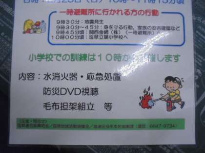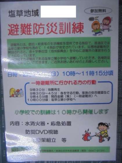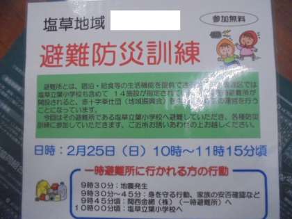 2月25日(日)に塩草地域の避難防災訓練が行われます。塩草立葉小学校へは、午前10時に集まっていただき、訓練を行います。お子さんと一緒にぜひご参加ください。