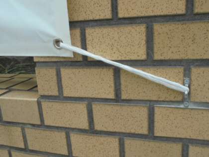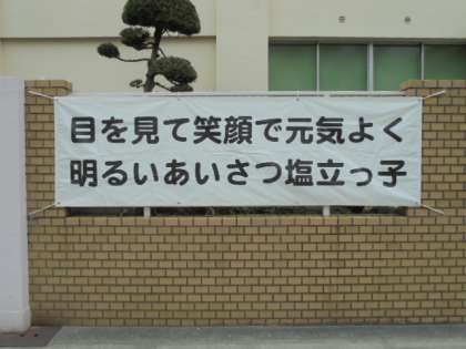学校の前にある「目を見て笑顔で元気よく 明るいあいさつ塩立って子」ののぼり。昨日、管理作業員の小林さんが四方を金具で止めなおしてくださいました。以前よりも、ピンと張っています。ありがとうございました!