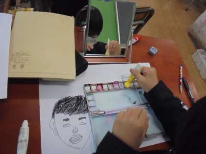 (上)鏡を使った自分の似顔絵、できあがってきました。(下)昔の道具について、絵であらわしています。