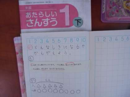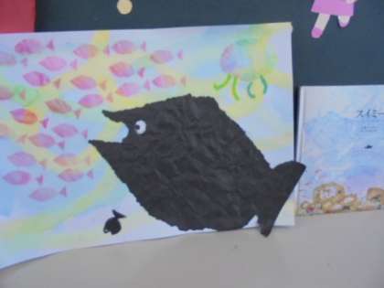 (上)算数の学習です。「どんなしきになるか かんがえよう」(下)絵本「スイミー」の図画作品ができあがっています。