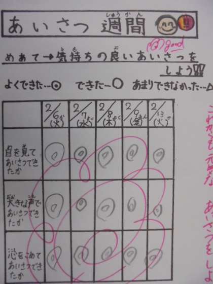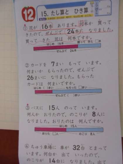 (上)あいさつ週間のカードです。よくできました。(下)算数の学習です。「たし算とひき算」を勉強しています。