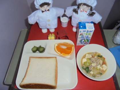今日の献立は、豚肉ととうふのうま煮、きゅうりの中華あえ、デコポン、パン、牛乳です。
