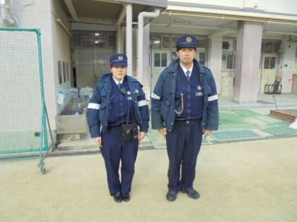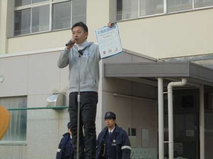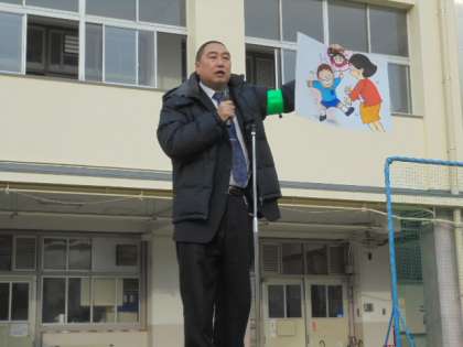 (上)今朝の全校朝会では、浪速警察署の生活安全課防犯係の井早 良太様がお越しくださり、子どもたちに「知らない人にはついていかない」などの防犯指導をしていただきました。(中)JR難波駅前交番のおまわりさんも来られました。(下)司会の岩下先生です。2月の生活目標を話しています。