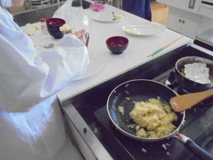 (上)理科で、「フットサル・ロボ」を作っています。かっこいいですね!(下)調理実習をしています。とてもおいしくできました。