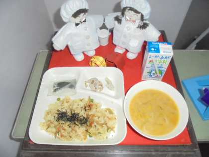 今日の給食は、鶏ごぼうご飯、みそ汁、焼きれんこん、牛乳です。