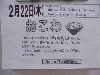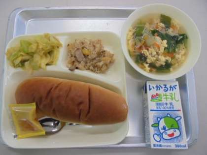 今日の献立は、中華おこわ、卵スープ、キャベツのオイスターソースいため、パン、牛乳です。